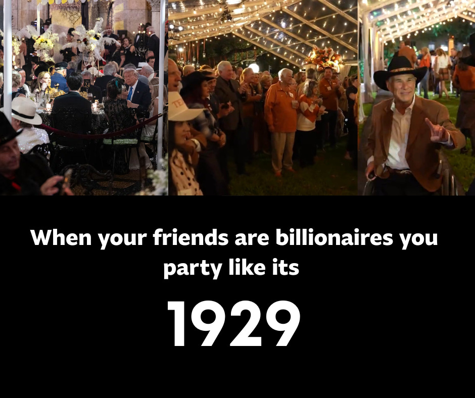 The MAGA regime is cutting SNAP, hiking prices, and hosting costume balls. Trump’s roaring 20s party is the soundtrack to America’s hunger crisis.#GatsbyGate #StarvingTexas #FeedFamiliesNotEgos