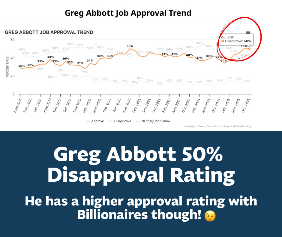 🥴 Greg Abbott’s approval rating is the only thing shrinking faster than the Texas middle class. #LowEnergyGreg #MAGAStarvesTexas