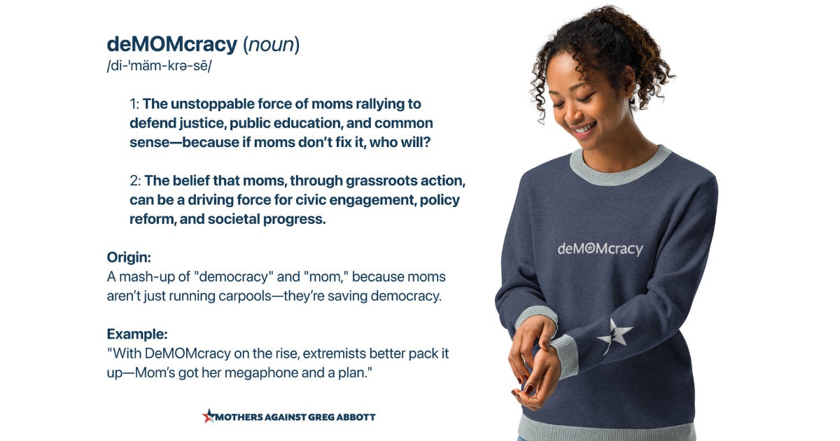 We are launching our deMOMcracy campaign to get more women and moms across America to join in our fight for Democracy. You can buy some of our new deMOMcracy swag here: https://mothersagainstgregabbott.com/shop/