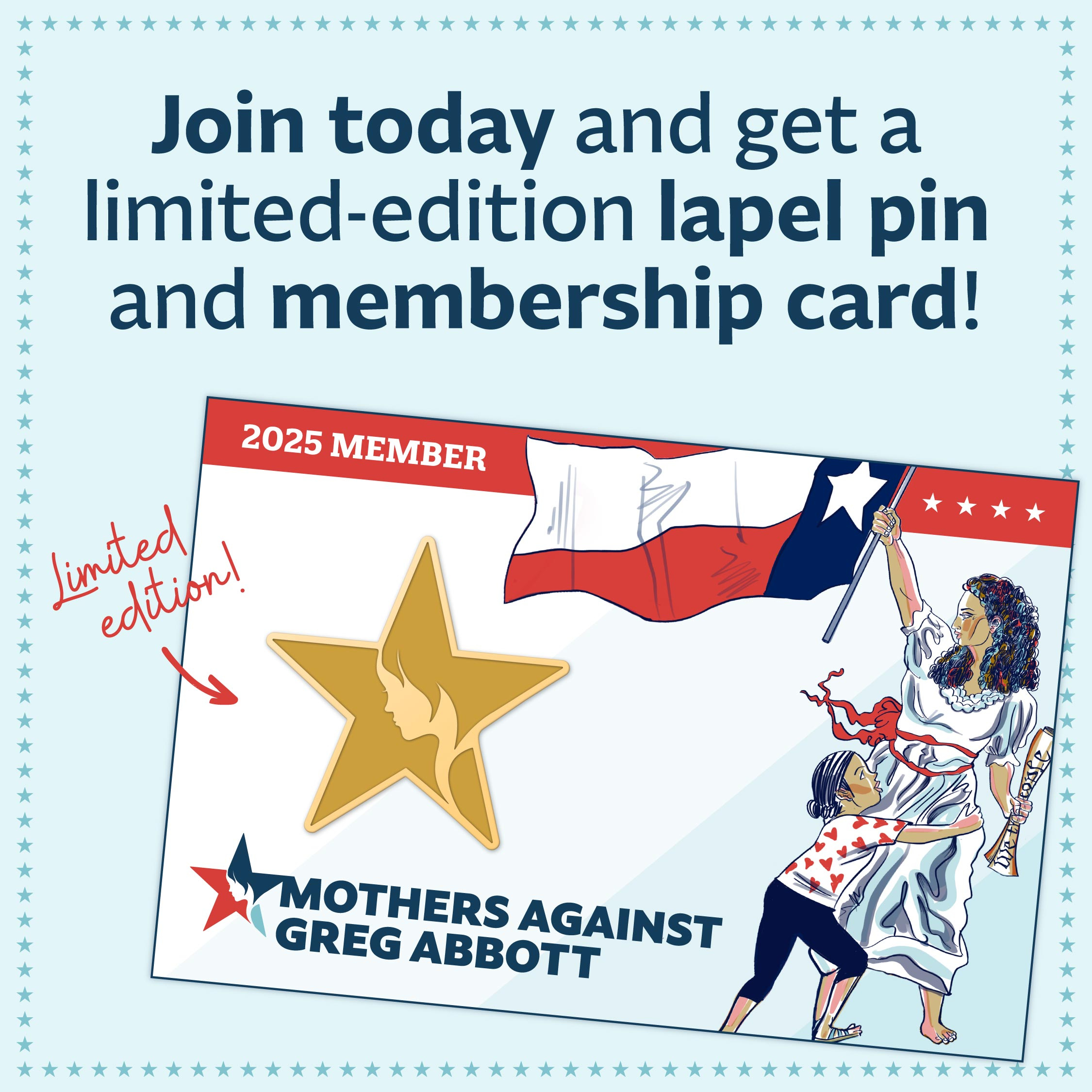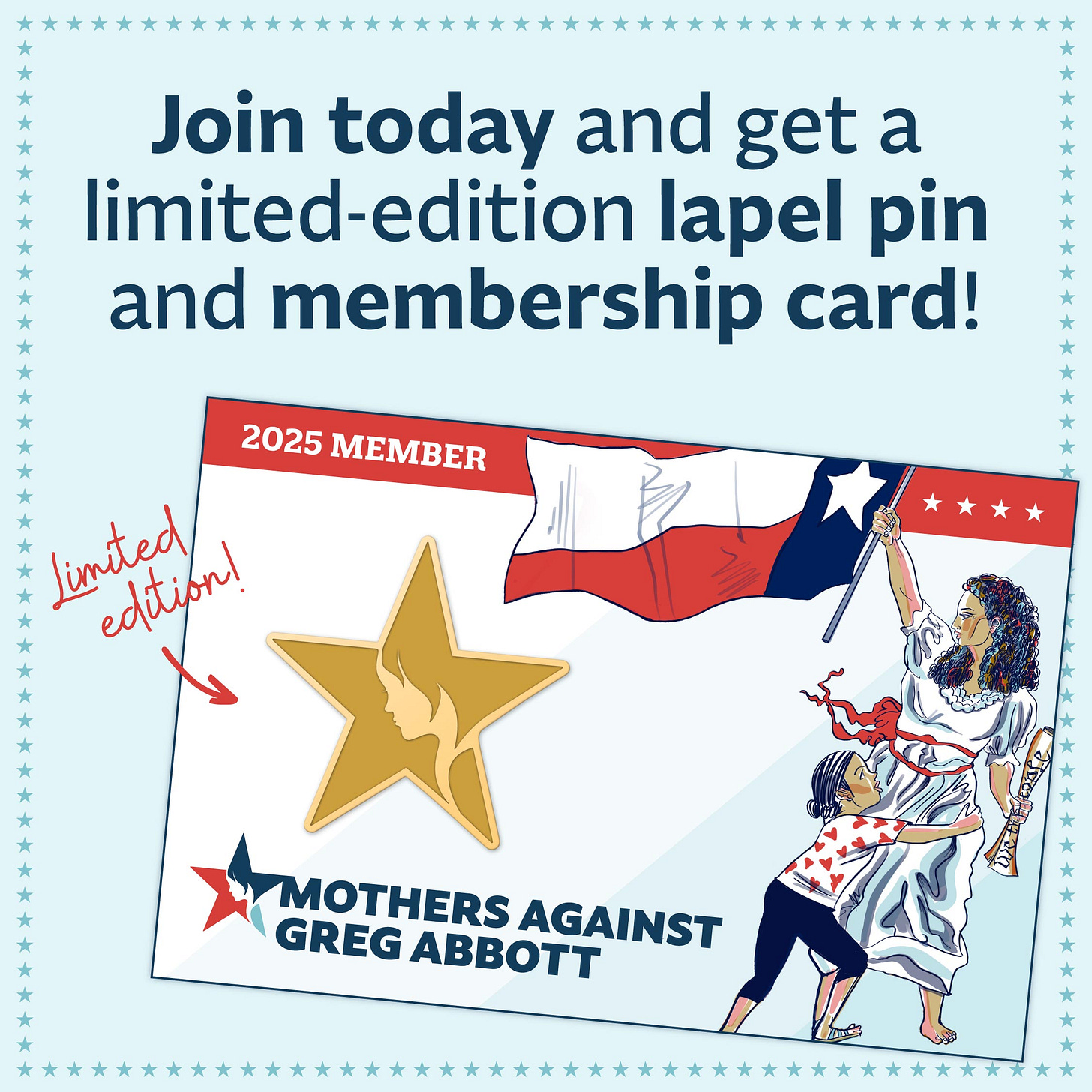 Mothers Against Greg Abbott is currently doing a Membership Drive and Members who donate $30 and up get a limited edition gold pin. Go here to donate: https://secure.actblue.com/donate/member-drive_10.