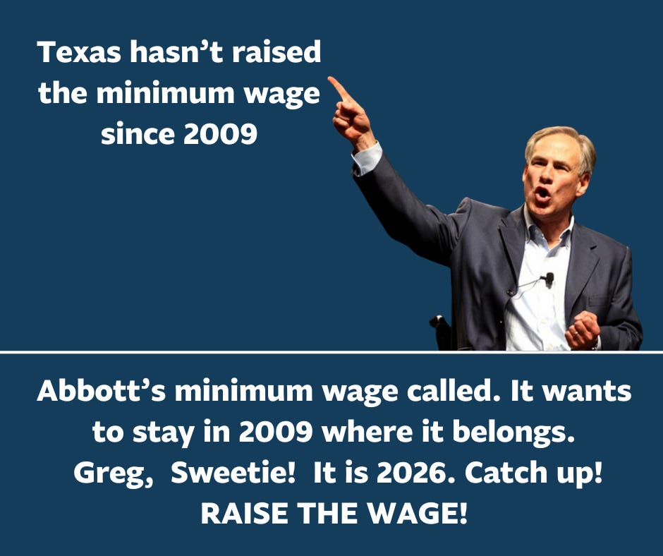 Greg Abbott loves to brag that Texas has the eighth-largest economy in the world. He says it so often, you would think he keeps the ranking framed next to his mirror and prays to it every morning. Yet here we are. Texas workers are still stuck with a minimum wage from 2009, $7.25 an hour.